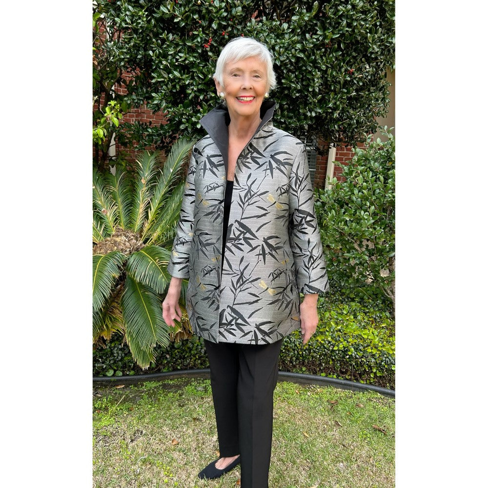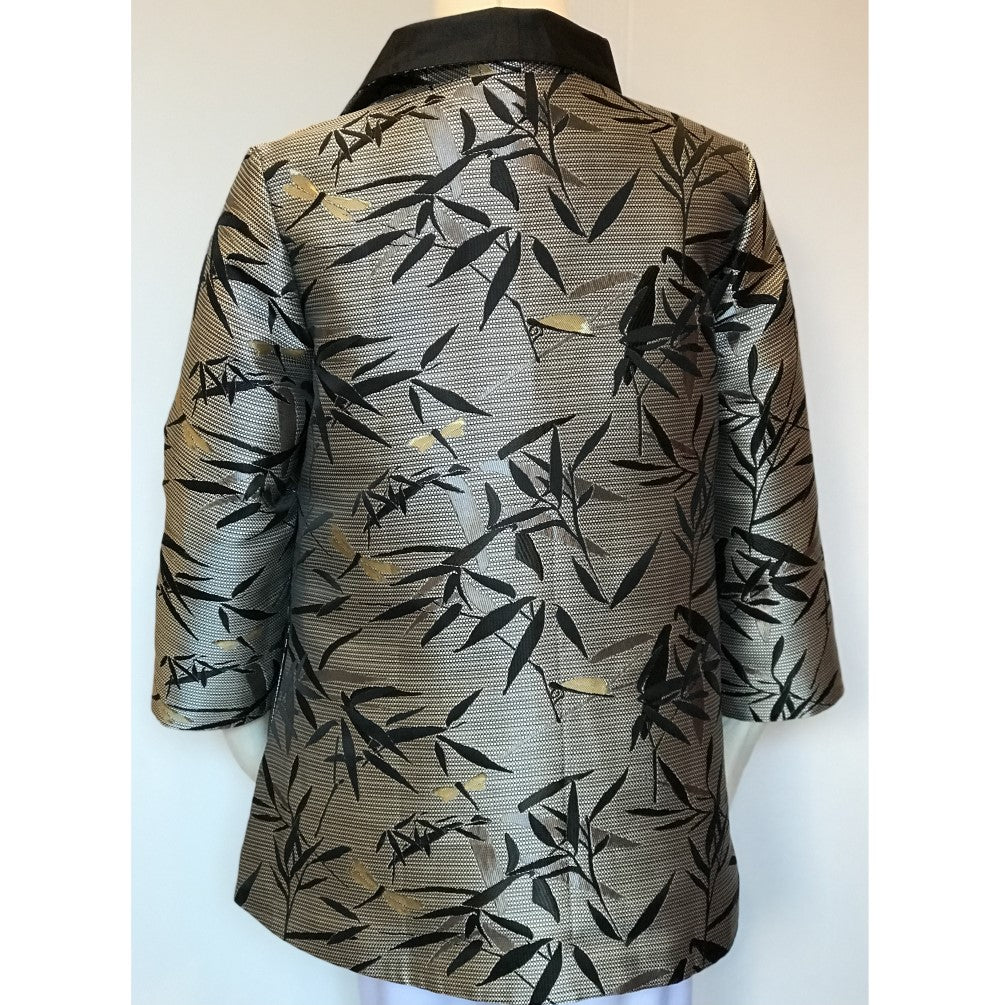 Our Bamboo Jacket is custom-made and reversible to plain black. The exquisite black and silver bamboo design has gold-winged dragonflies scattered throughout. It is a stunning jacket for your upcoming special event. The winged collar will frame your face. There are side seam pockets on the printed side only. Nylon and polyester. Please dry clean. S(6-8), M(8-10), L(10-12), XL(12-14), XXL(14-16) Please note: The cut is narrow across the back.