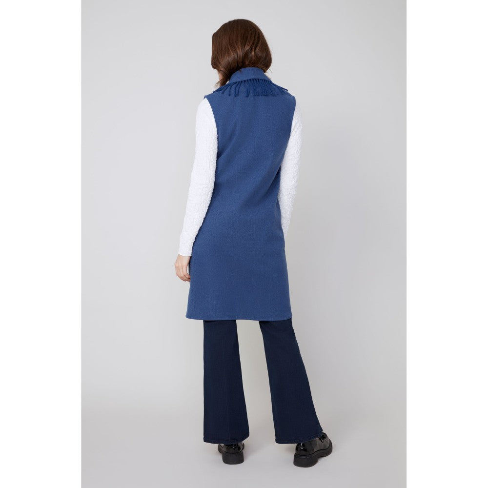 This is Gloria’s favorite. She had to have denim-colored one. The felted fabric feels so soft, and it is incredibly cozy. It has fringe which adds to the “wow” factor. The patch pockets are cool, too. It is unlined and has no closure. Polyester and rayon. Please dry clean. XS(4-6), S(6-8), M(8-10), L(10-12), XL(12-14)
