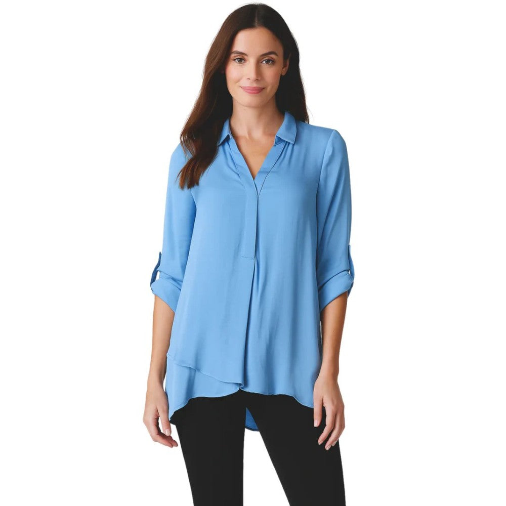 Sky blue is a breath of fresh air. Our ever-popular airflow blouse is available in a stunning color. It is a mainstay in our wardrobe because it feels like wearing air. The polyester fabric has been dyed using a special process called airflow dyeing. It is silk-like and lightweight. There are roll-tab sleeves and an eye-catching double layer on the front. Machine washable, but please hang to dry. XS(4-6), S(6-8), M(8-10), L(10-12), XL(12-14)