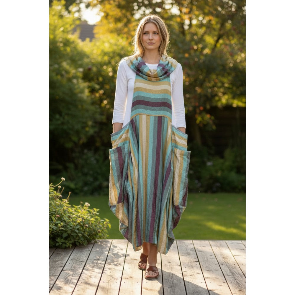 Ava is Outstanding! This dress is made from a shimmering metallic striped fabric that has a crinkled texture. Not only is the fabric incredible, but the cut is quite the fashion statement. The cowl neck is the perfect complement to the exaggerated skirt, with its many folds and extended side panels. Make it yours, by varying the top that you choose to layer underneath. It feels silky and is lightweight. Polyester. XS(6-8), S(8-10), M(10-12), XL(12-14)