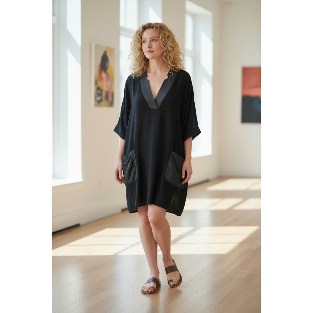 Back by popular demand! This black dress is named after one of our favorite people because she loves it and looks great in it. You, too, will love the Geriann Dress. It is effortless and trés chic. The wide satin-like v-neckline has two notches for visual appeal. Also, the two front patch pockets are in the same satin-like fabric adding cohesion to the design. Its generous cut and elbow-length sleeves are bonuses. Polyester and spandex. May machine wash. XS(6-8), S(8-10), M(10-12), L(12-14), XL(14-16)