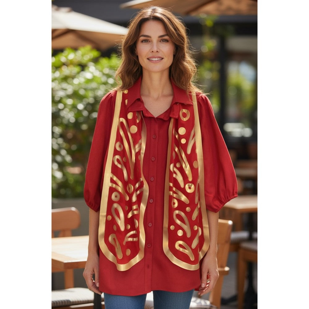 Wearable Art! This is a remarkable red hand-painted silk scarf. It has an abstract, whimsical design of dots, rings, and teardrop shapes. The metallic gold outline, made from silicone, is what makes it so incredibly eye-catching. This is the ultimate necklace. Our silk scarf is available in either a standard (7” x 60") or a large (9”x 70") size. May handwash, but please do not wring or knot. Please note: Sizes are an approximation.