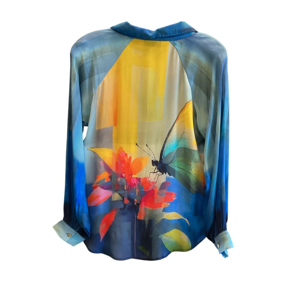 Fresh and Fun! The whimsical butterflies and the vibrant colors make this top a must-have. The silk-like fabric combination of cupro and viscose will make it your favorite. It feels heavenly. Machine washable. XS(4-6), S(6-8), M(8-10), L(10-12), XL(12-14)