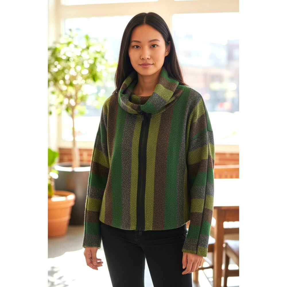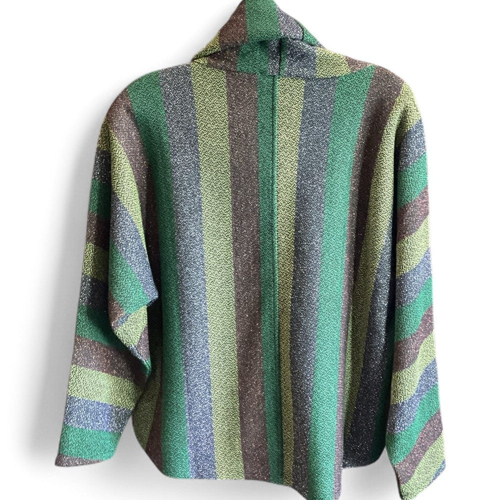 The Cactus Topper is sure to be your next holiday go-to piece. The alternating stripes of bronze, lime, silver and emerald are accented with a decorative black zipper. It has a cowl neckline and is unlined. Pair this with your favorite black bottom or jeans for a festive yet more casual vibe. XS(2-4), S(4-6), M(6-8), L(10-12). Machine Wash.