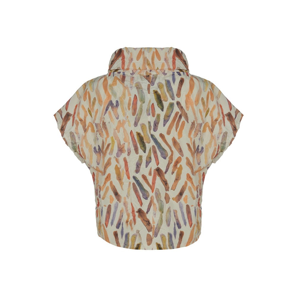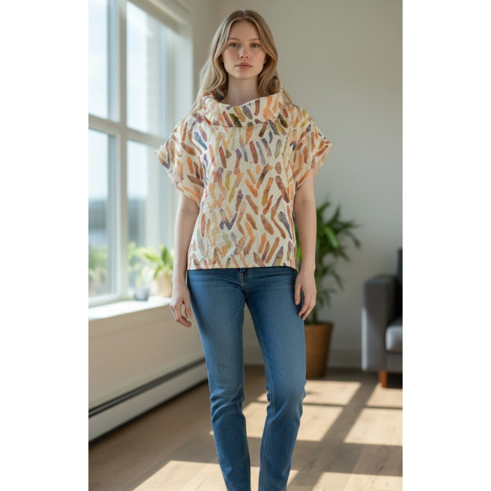 Happy! The Trio Top has a playful color combination and pattern. Also, the neckline frames your face and is youthful. Another feature that we love is the crinkled texture of the lightweight polyester fabric. It makes it perfect for travel. Machine washable. XS(4-6), S(6-8), M(8-10), L(10-12), XL(12-14) Please note: A matching cropped, wide-leg pant is available. Please call the store for details.