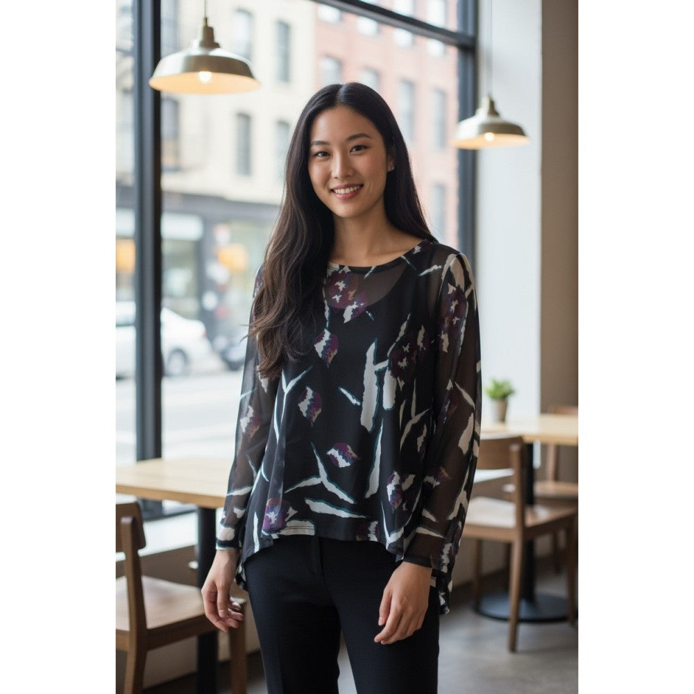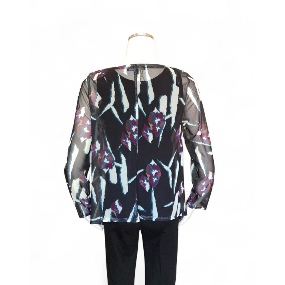 Fashionable and Versatile! The Brittany Topper is a sheer black topper. Your look will change depending on the item that you wear under it. The abstract pattern features a striking color combination of teal, deep plum, and white. Of course, it looks its best with straight black bottoms and a black tank. Polyester and spandex. Please handwash. XS(4-6), S(6-8), M(8-10), L(10-12), XL(12-14), XXL(14-16)