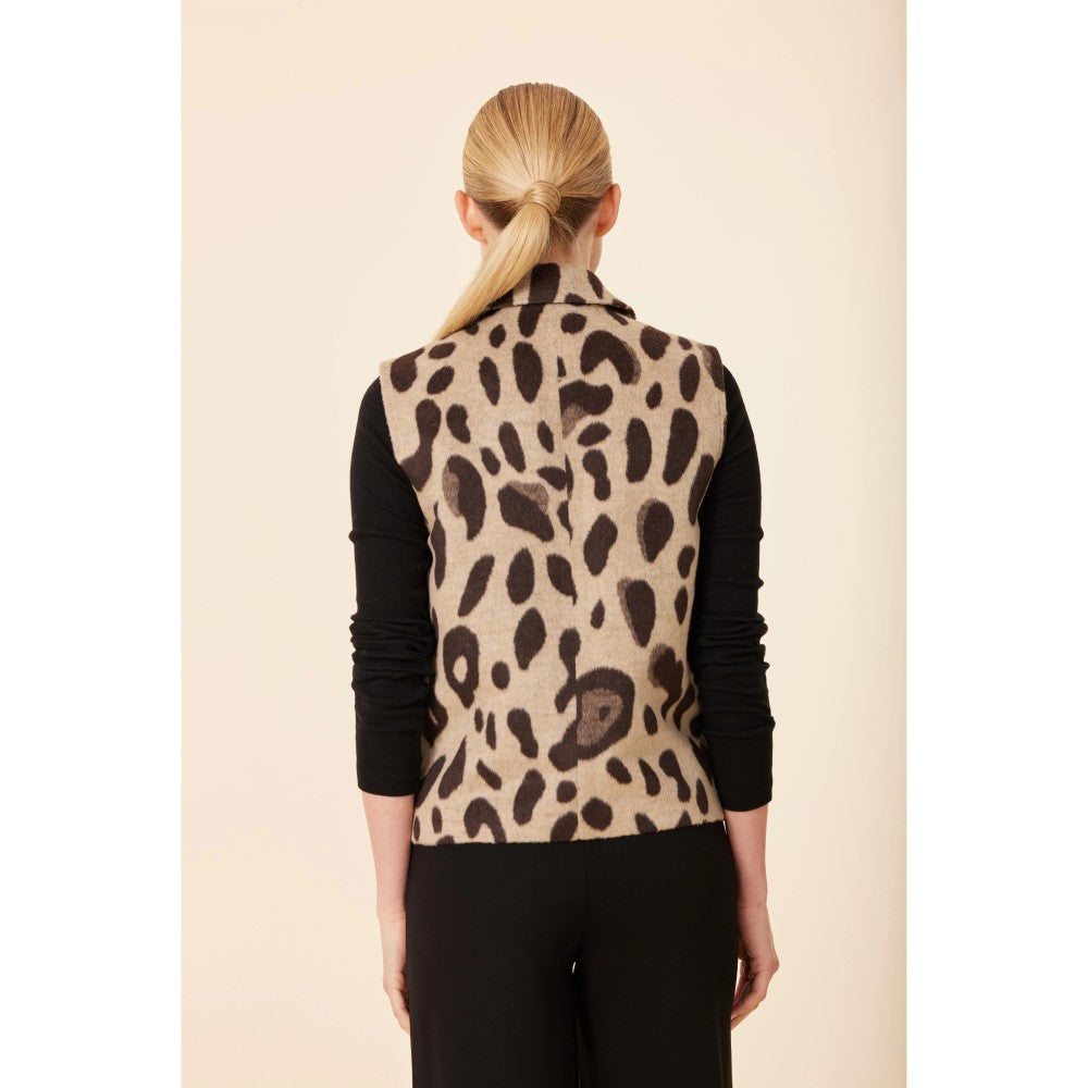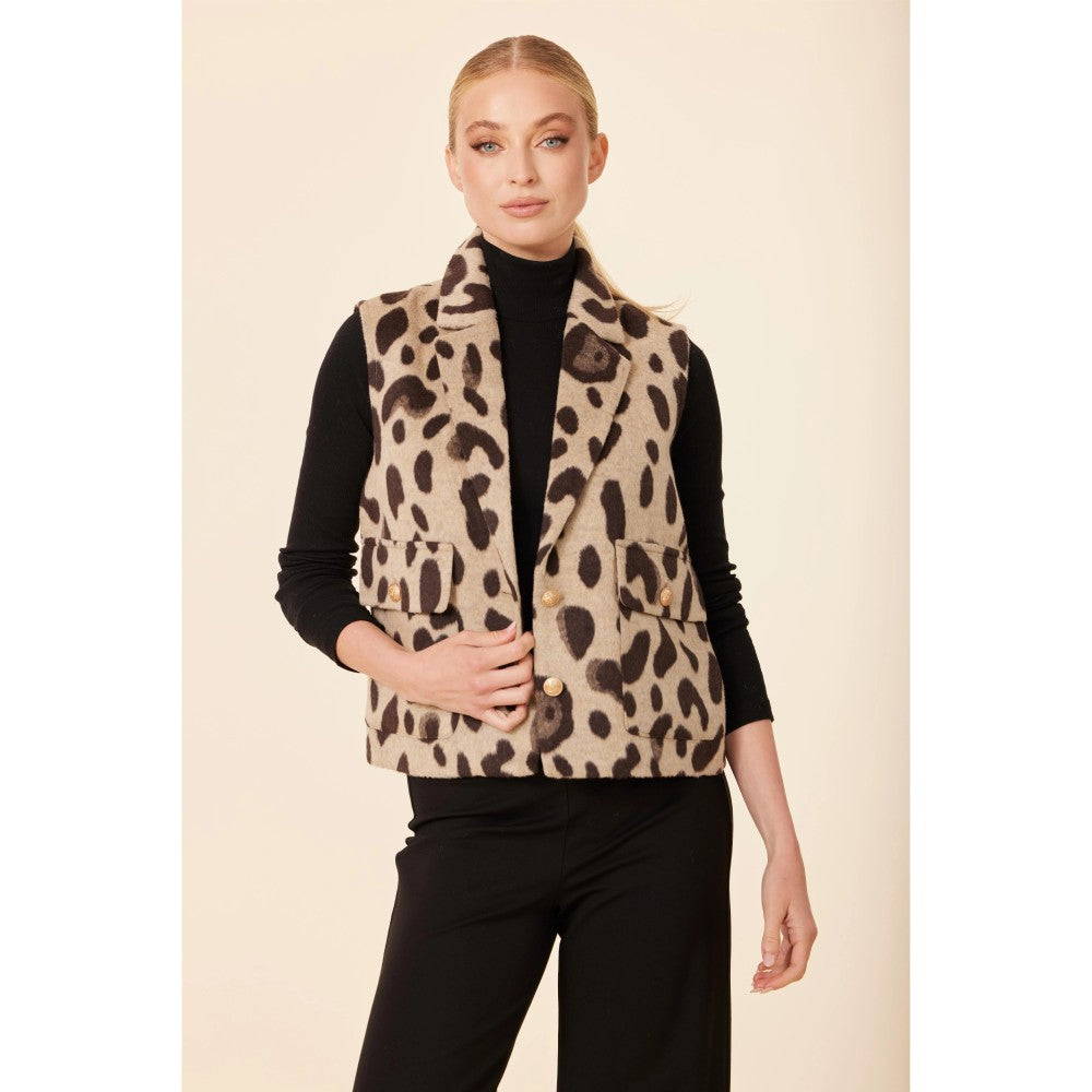Claudia, you are such sass! The soft, felted fabric has a sable-colored animal print that is quite fetching. The rose-gold buttons, notched lapels, and flap front pockets are classic design elements that add sophistication to the Claudia Vest. It is lined. Polyester. Please dry clean. XS(4-6), S(6-8), M(8-10), L(10-12)