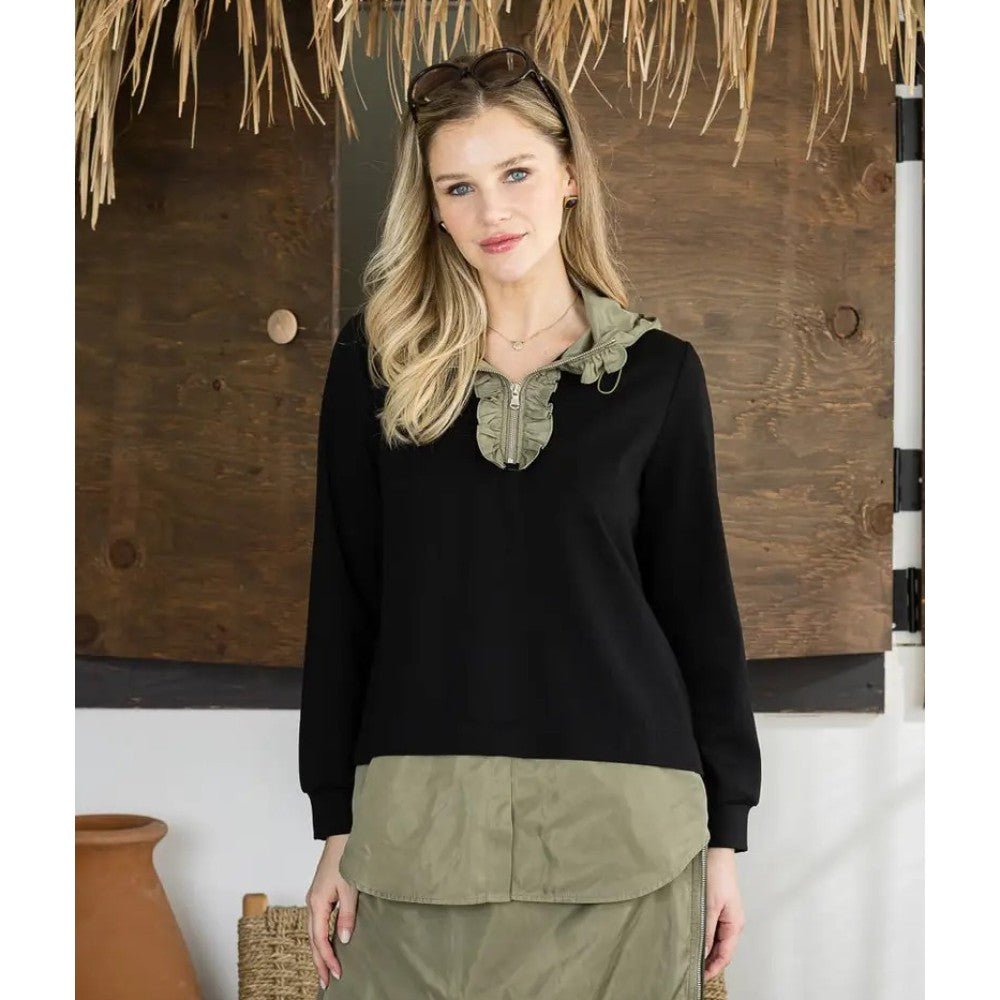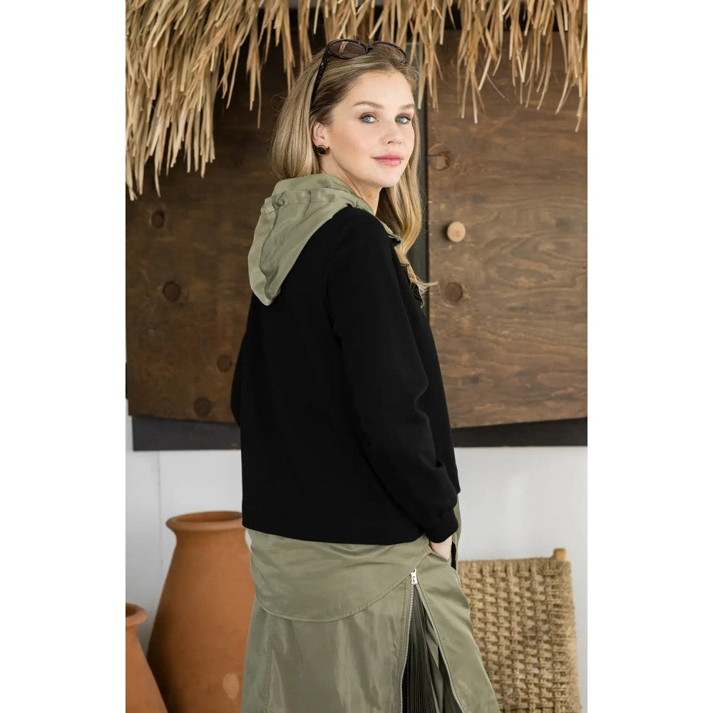 Sporty and Chic! The color of any season seems to be olive. The Katie Top has the olive by your face, which is ideal. The ruffled neckline lends femininity to the adjustable hoodie and the shirttail hem. The satin-like olive fabric contrasts nicely with the black scuba-like fabric of the body. Polyester. Please handwash. S(6-8), M(8-10), L(10-12), XL(12-14)