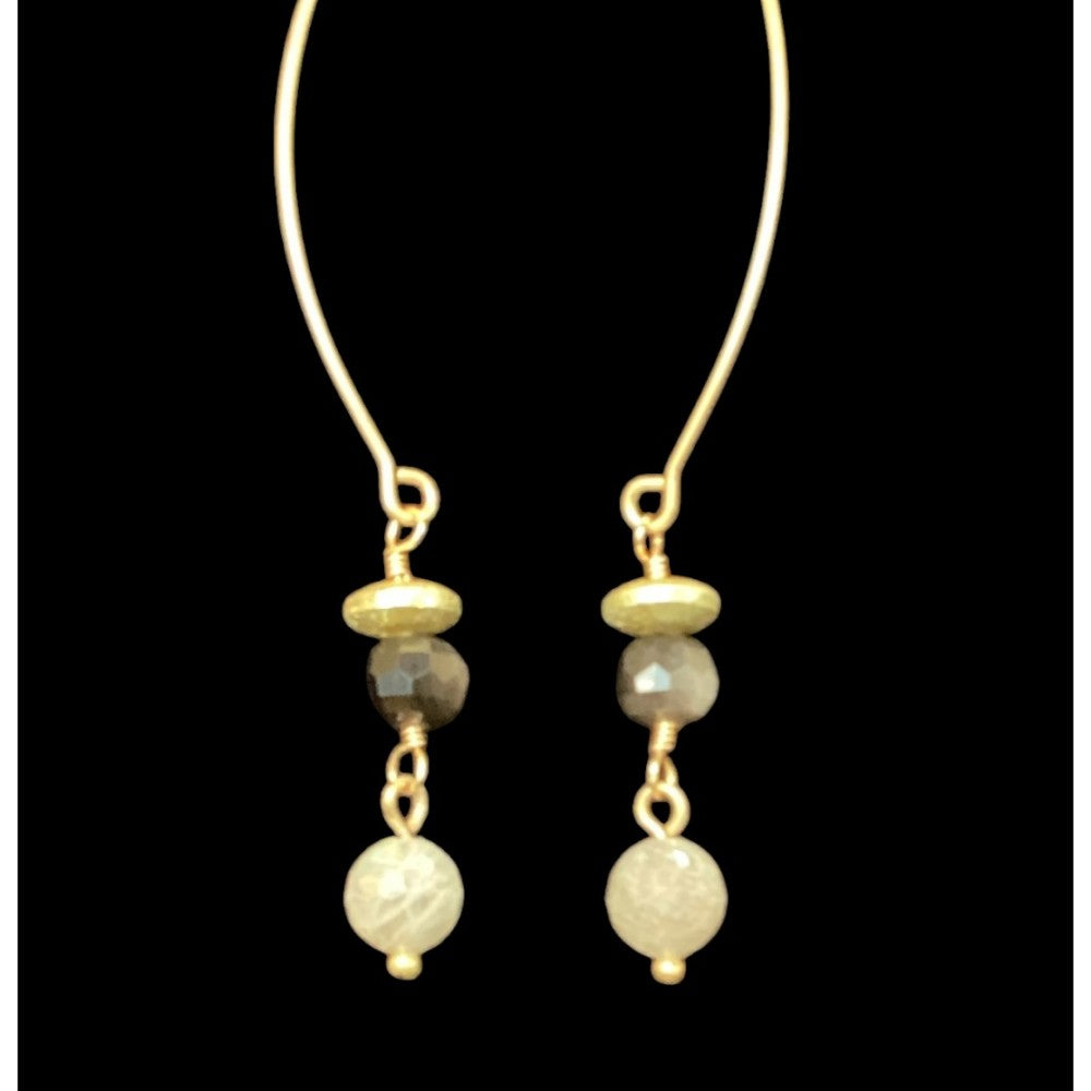 Lady Liberty is Gorgeous! The ever-popular coin jewelry is here to stay. This particular beauty is Gloria's favorite. The silver coin is surrounded by matte gold. Along the gold-plated necklace and in the earrings are moonstone and chocolate obsidian. Together, all of the elements create an envious set. The adjustable necklace is 17 1/2" long and the fishhook earrings are 3" long.